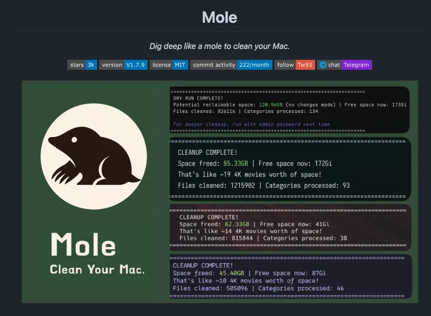 Mole 是一款轻量级开源的 Mac 系统清理工具,通过命令行交互方式深度清理缓存日志临时文件、彻底卸载应用残留(扫描 22+ 个位置)、分析磁盘空间占用并快速删除大文件,支持试运行预览、白名单保护和 Touch ID 授权,比 CleanMyMac 更彻底且完全免费。