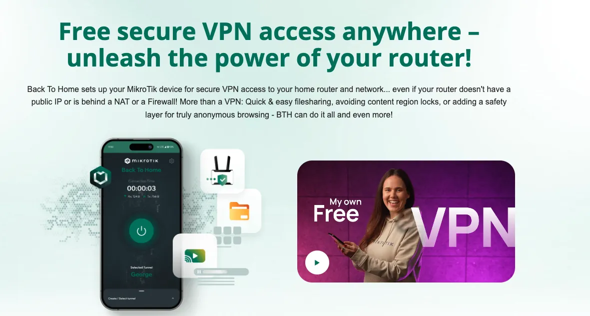 Back To Home(简称 BTH)是 MikroTik 推出的便捷 VPN 功能,基于 WireGuard 实现端到端加密,可让你的手机或电脑安全地连接回家中的路由器和内网,即便路由器没有公网 IP 或位于 NAT/防火墙之后,BTH 也能通过 MikroTik 的中继服务建立连接(中继不解密流量,仅协助穿透)。