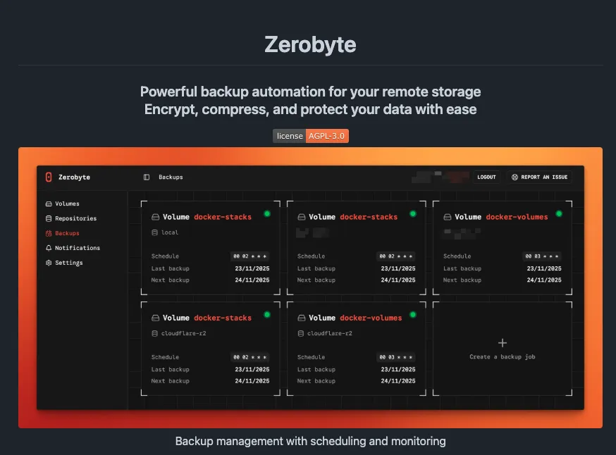 Zerobyte 是基于 Restic 的开源备份自动化工具,提供现代化 Web 界面管理加密备份,支持 NFS、SMB、WebDAV、本地目录和 40+ 云存储(通过 rclone),具备灵活的调度策略、端到端加密、保留策略和 Docker volume 插件功能。